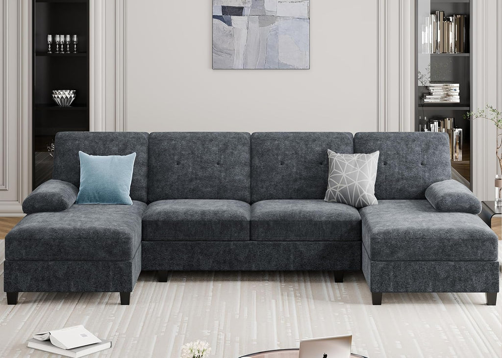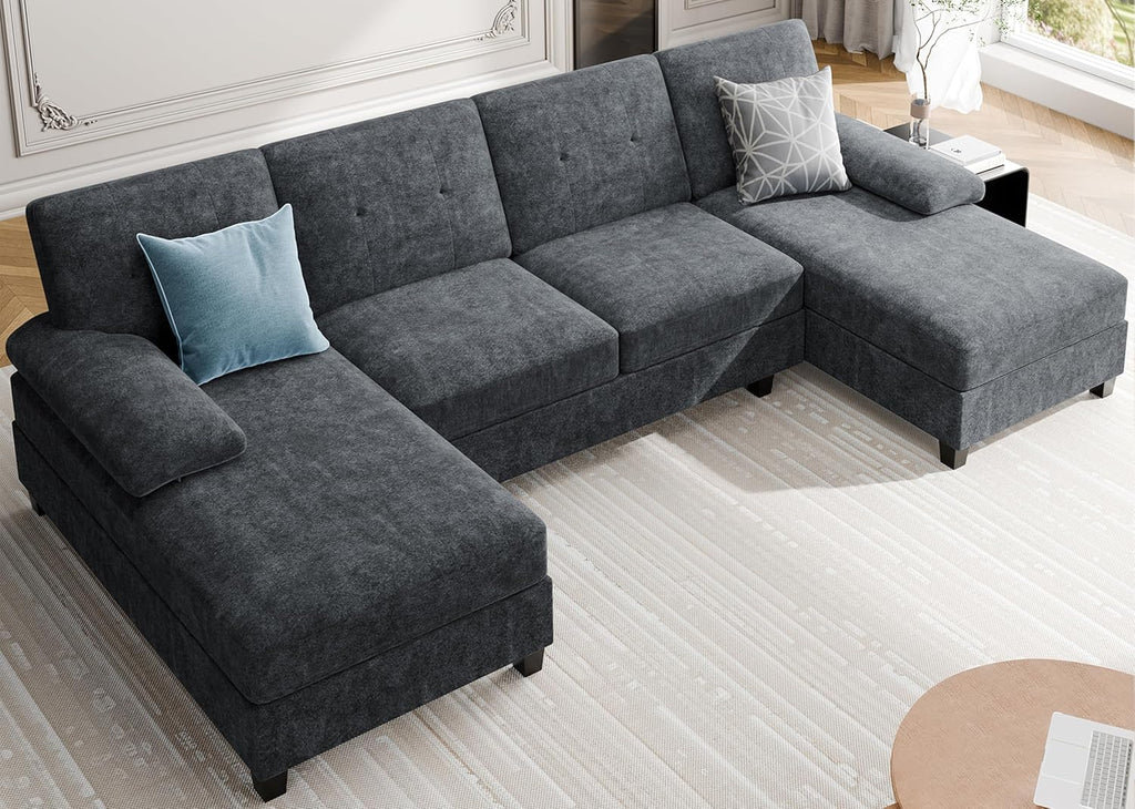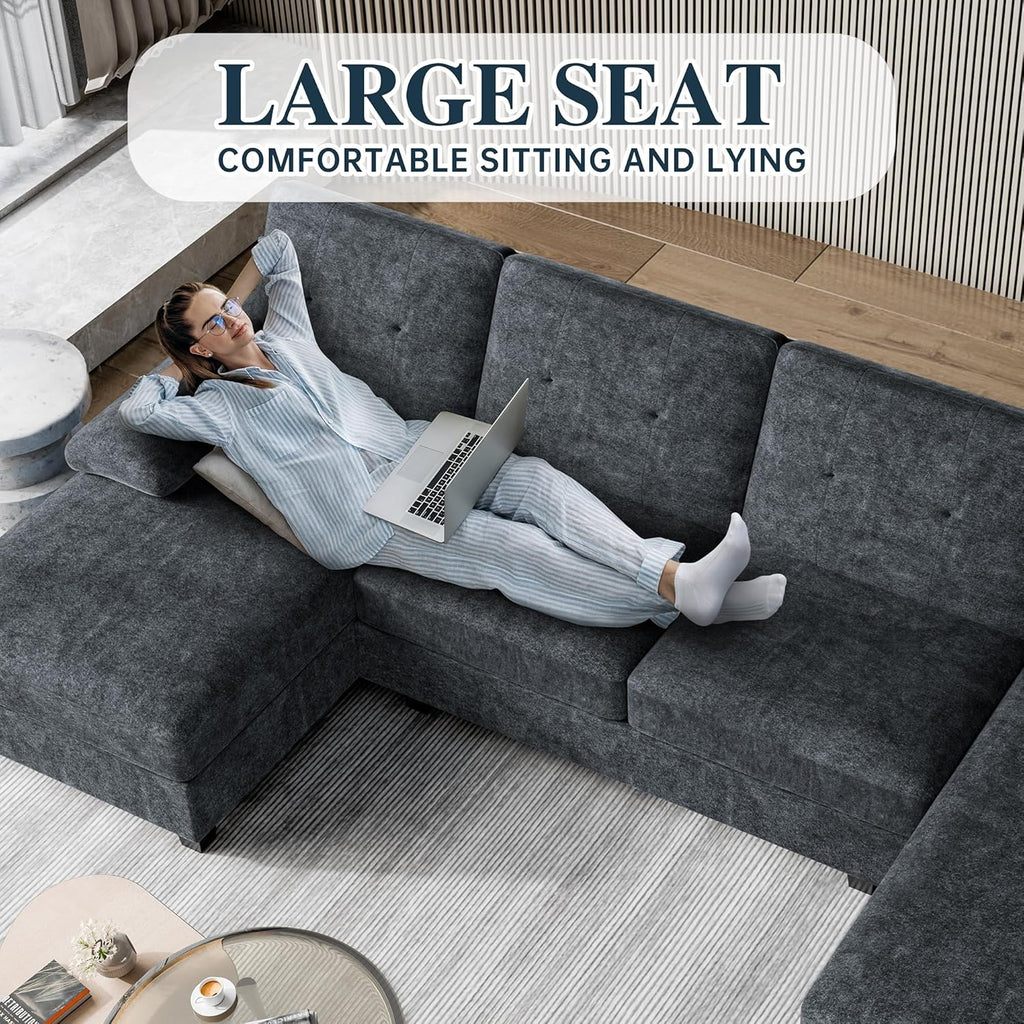 Transform your living space with this spacious U-shaped sectional sofa designed for ultimate comfort and style. Featuring a generous 4-seat layout with a chaise lounge and padded armrests, this grey sectional accommodates up to four people with a 1200-pound weight capacity. The memory foam fill and cushion back provide plush support, while the solid wood frame ensures durability. At 106.3 inches wide and 50.4 inches deep, it's perfectly sized for apartments and larger living rooms alike. The modern design complements any décor, and maintenance is simple—just wipe clean with a dry cloth. Assembly required.