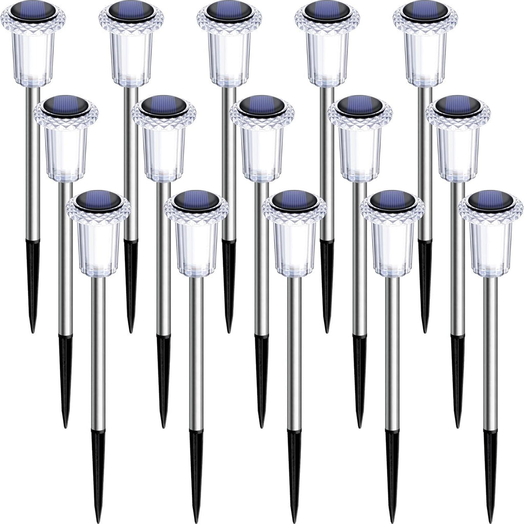 DenicMic Solar Lights Outdoor 15 Pack Waterproof 3000K Warm White LED Acrylic lamp Head Stainless Steel Stake for Landscape Lighting Path Walkway Sidewalk Backyard Patio Decor